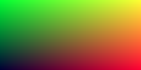 The first step is to produce a PPM file that demonstrates we can create images at all. All it does is alter the red and green channel during iteration over the pixels to create a color gradient. Our image size is defined at the top. In the C++ code, it is locked to a 200px x 100px image, but I found that that scaling it by 3x to 600x300 is more visually engaging, so I switched in the Lua code to reflect that. PPM files are easy to create, but very inefficient. In the spirit of "make it work, make it right, make it fast", I'll worry about optimizing the file format later, and probably only if needed.